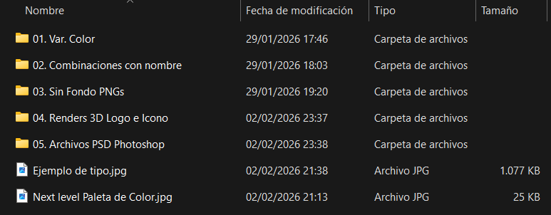 En este apartado os dejo todo el material final que forma parte de la identidad visual de Next Level, listo para usar.