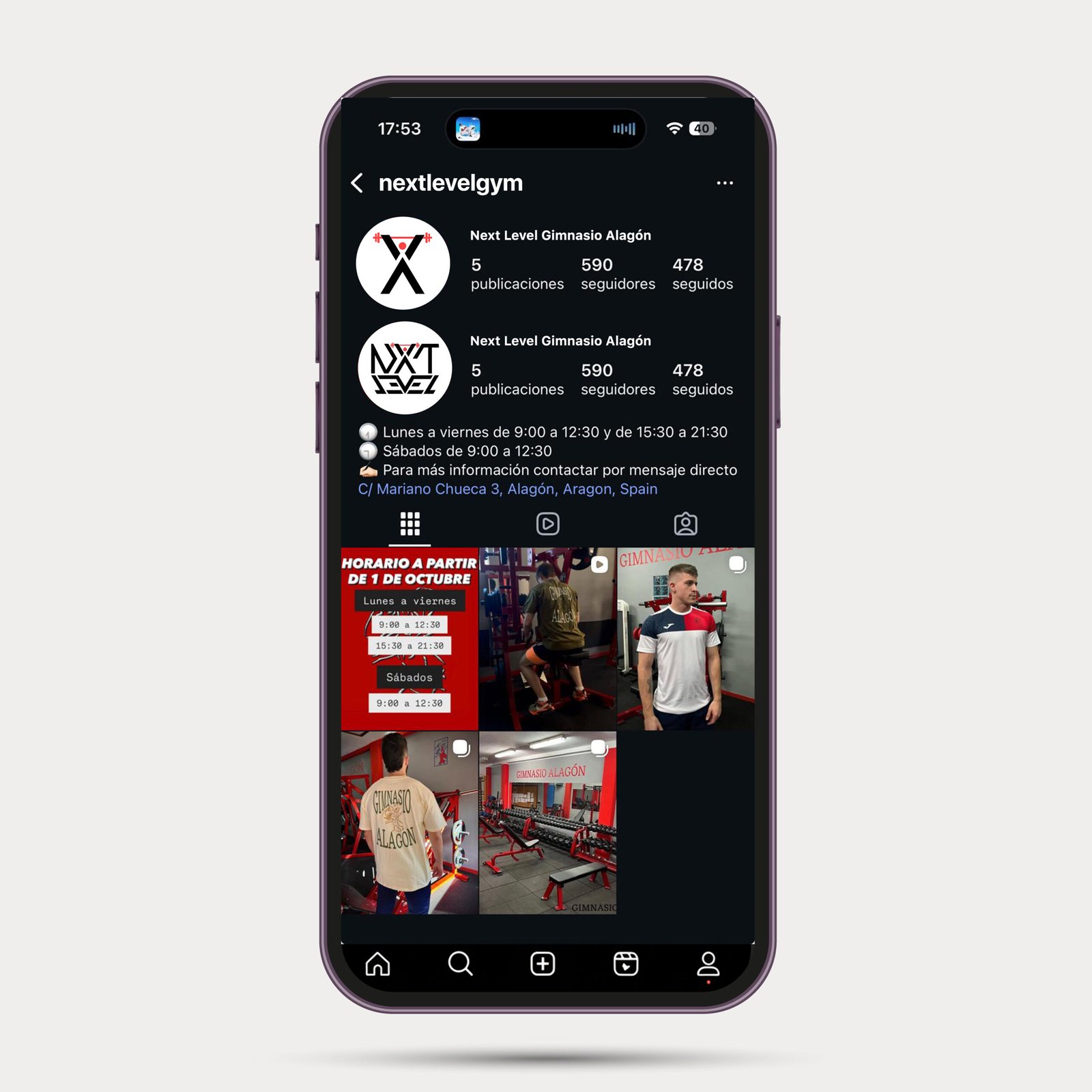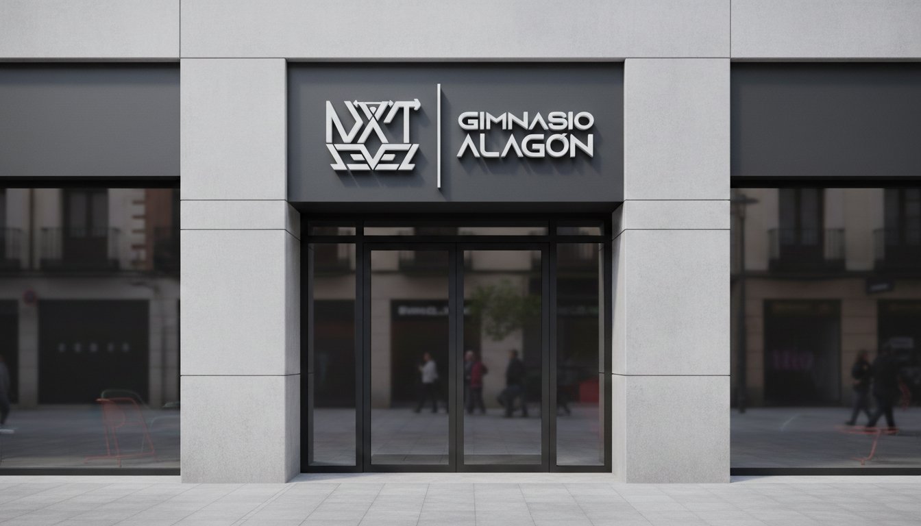 En el caso actual, la combinación es Next Level · Gimnasio Alagón. Esta estructura permite identificar el centro de forma clara sin perder fuerza de marca.