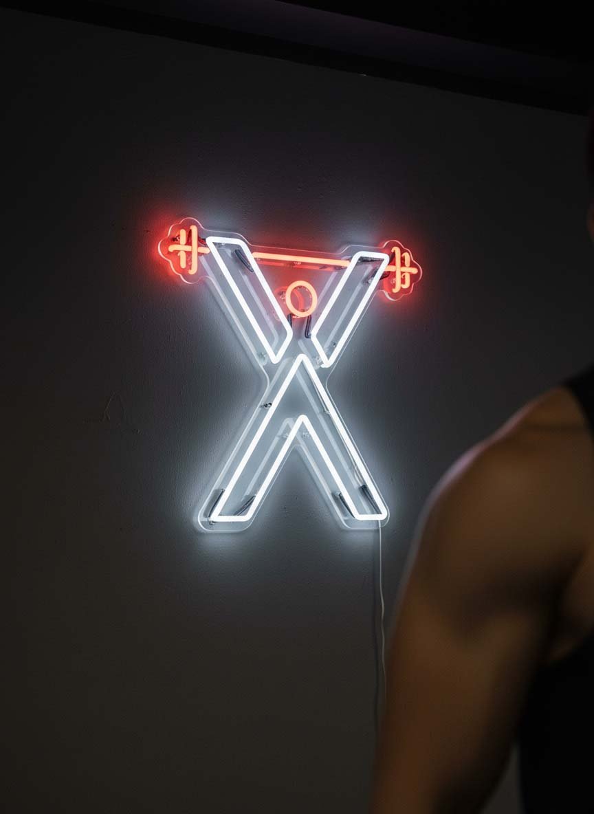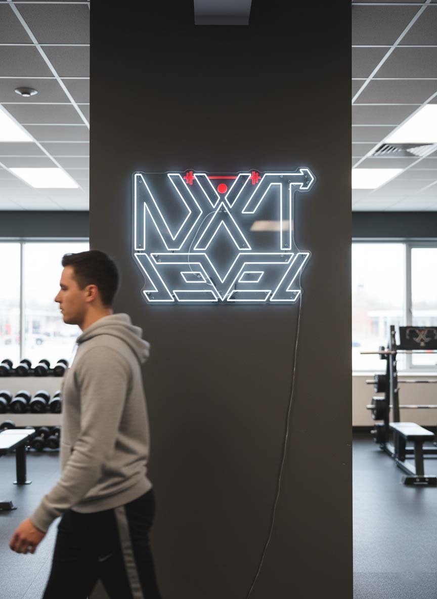 Tiene una estética fuerte, geométrica y directa, que encaja muy bien con el carácter del logo y con la idea de progreso y disciplina del gimnasio.